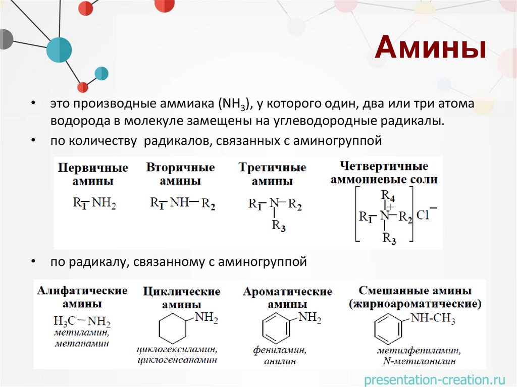 Амины• это производные аммиака (NH3), у которого один, два или три атома