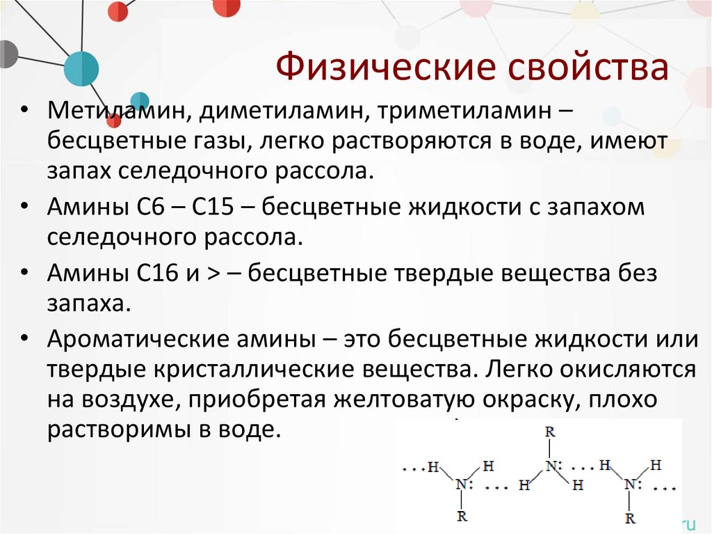 • Амины С6 – С15 – бесцветные жидкости с запахом