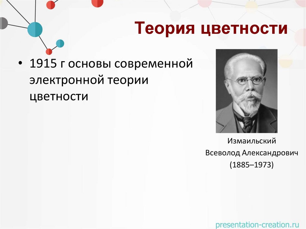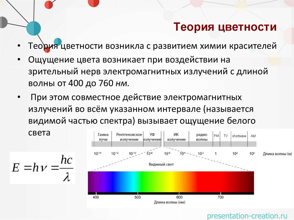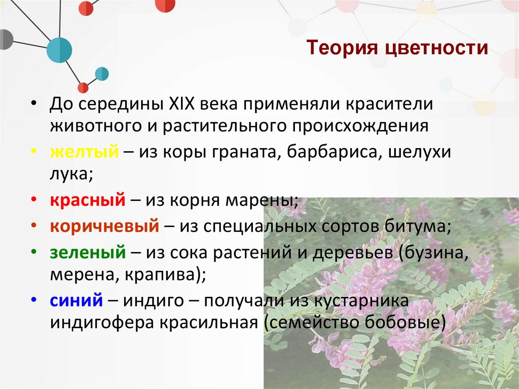 Теория цветности• Теория цветности возникла с развитием химии красителей