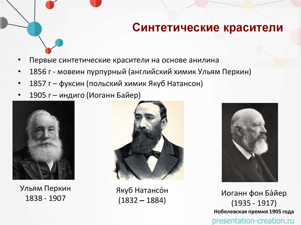 1856 г - мовеин пурпурный (английский химик Ульям Перкин)