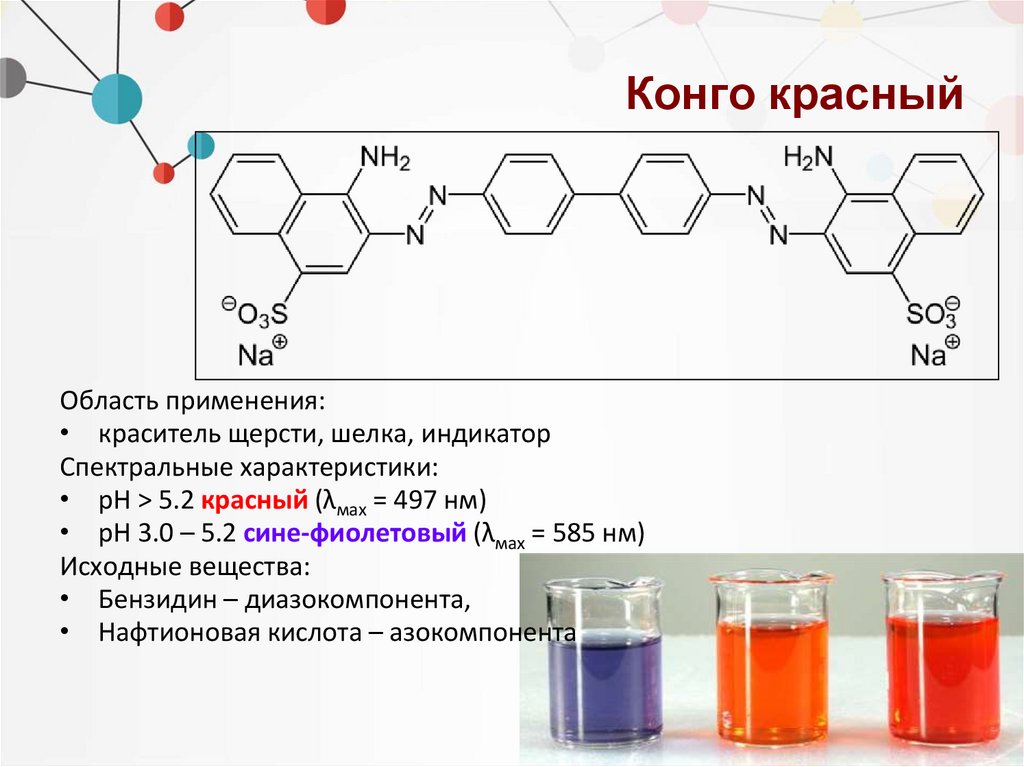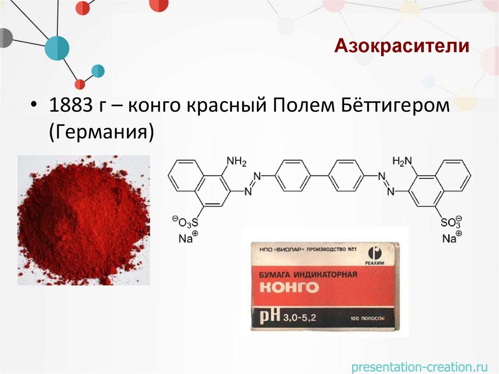 Азокрасители• 1883 г – конго красный Полем Бёттигером