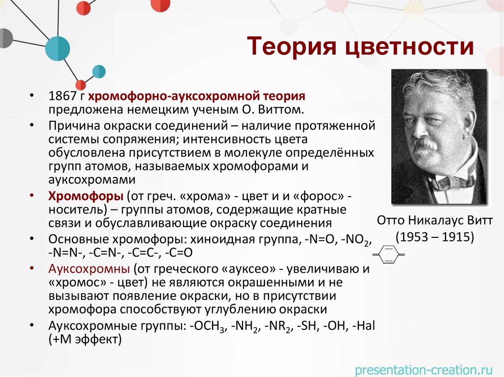 Теория цветности• 1867 г хромофорно-ауксохромной теория
