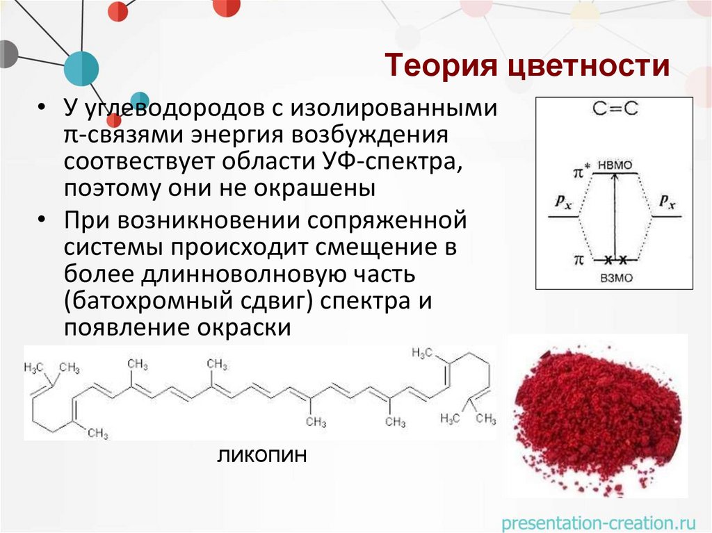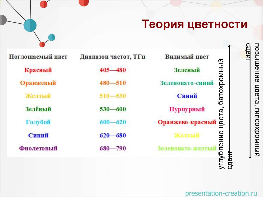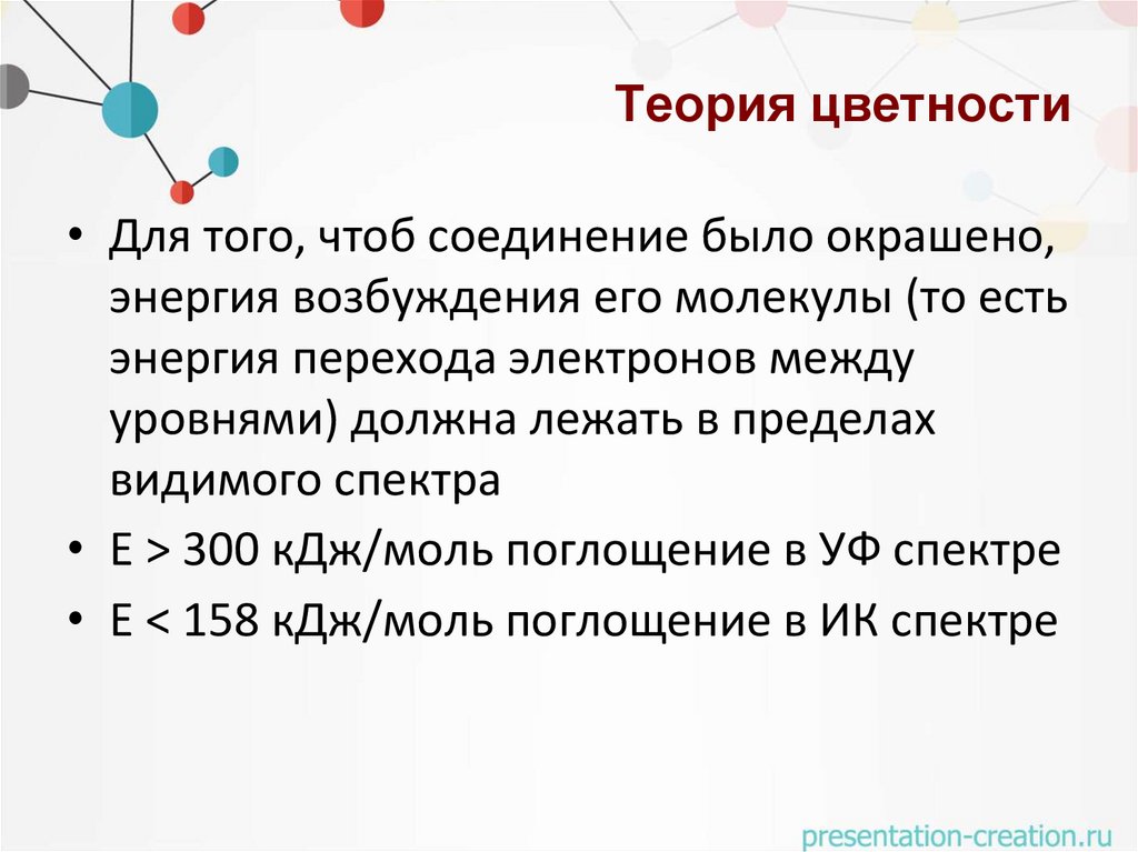 Теория цветности• Для того, чтоб соединение было окрашено,