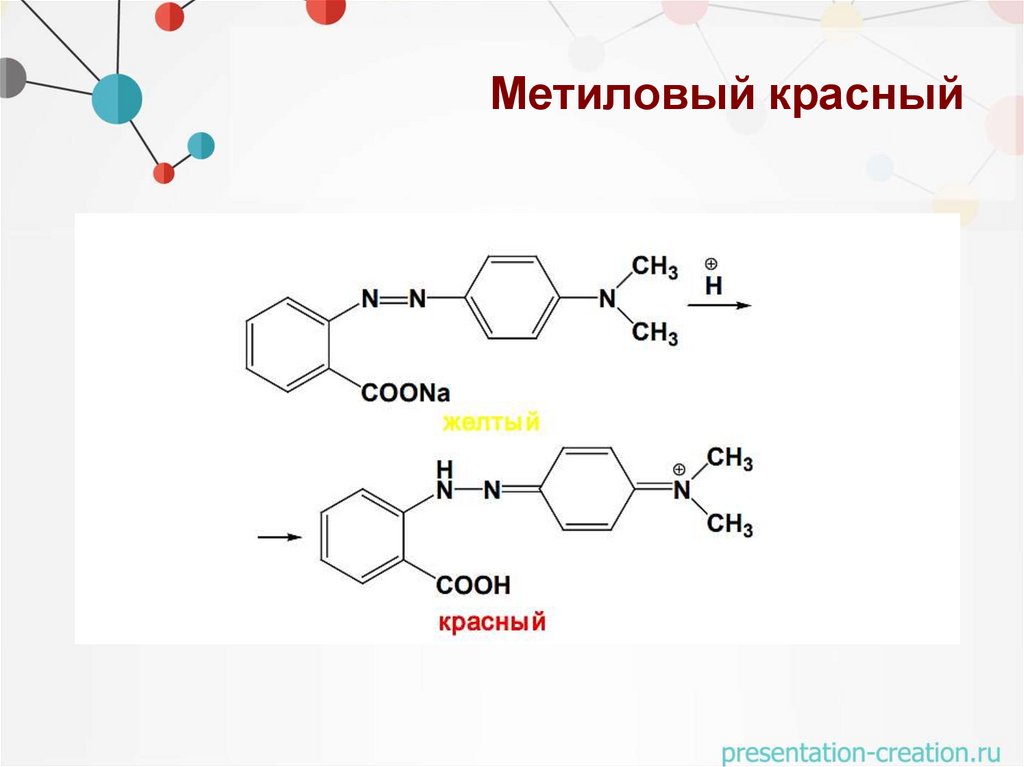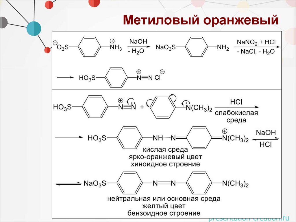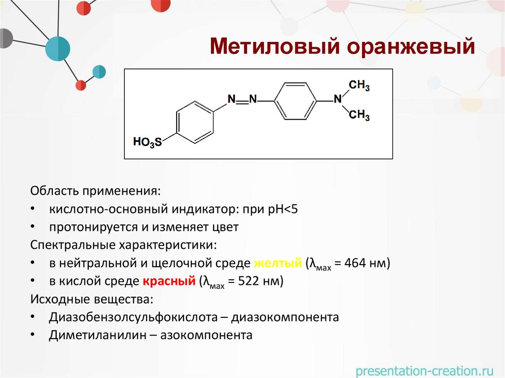 • в нейтральной и щелочной среде желтый (λмах = 464 нм)