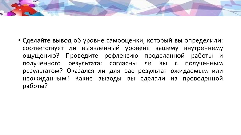 • Сделайте вывод об уровне самооценки, который вы определили:соответствует ли выявленный уровень вашему внутреннему