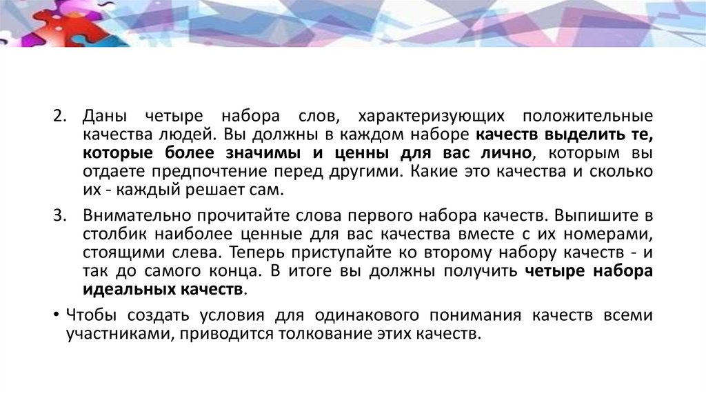 2. Даны четыре набора слов, характеризующих положительныекачества людей. Вы должны в каждом наборе качеств выделить те,