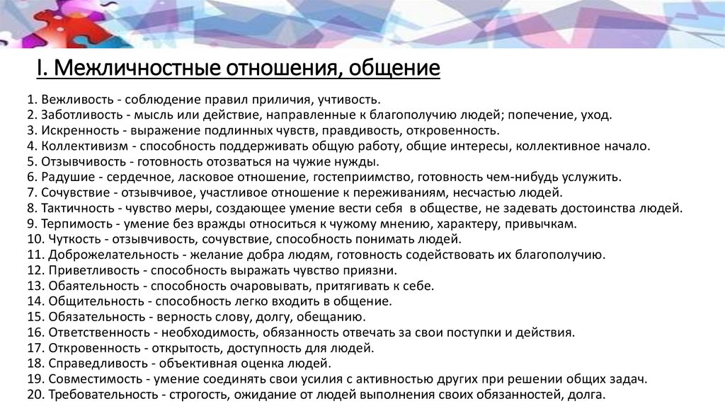 I. Межличностные отношения, общение1. Вежливость - соблюдение правил приличия, учтивость.
