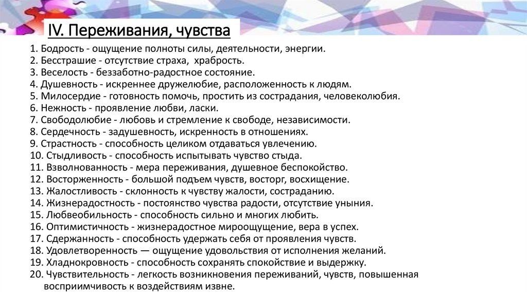 IV. Переживания, чувства1. Бодрость - ощущение полноты силы, деятельности, энергии.