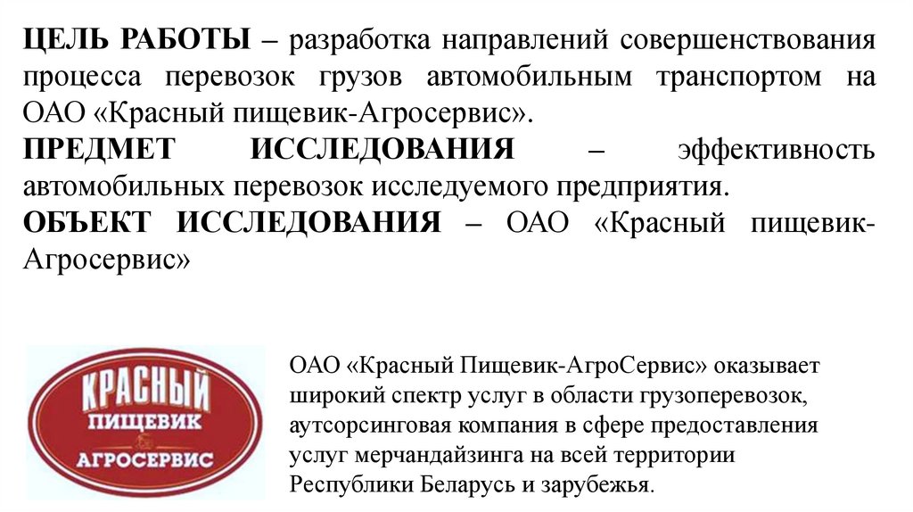ОБЪЕКТ ИССЛЕДОВАНИЯ – ОАО «Красный пищевикАгросервис»