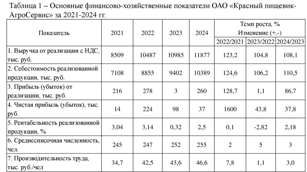 Таблица 1 – Основные финансово-хозяйственные показатели ОАО «Красный пищевикАгроСервис» за 2021-2024 гг.Показатель