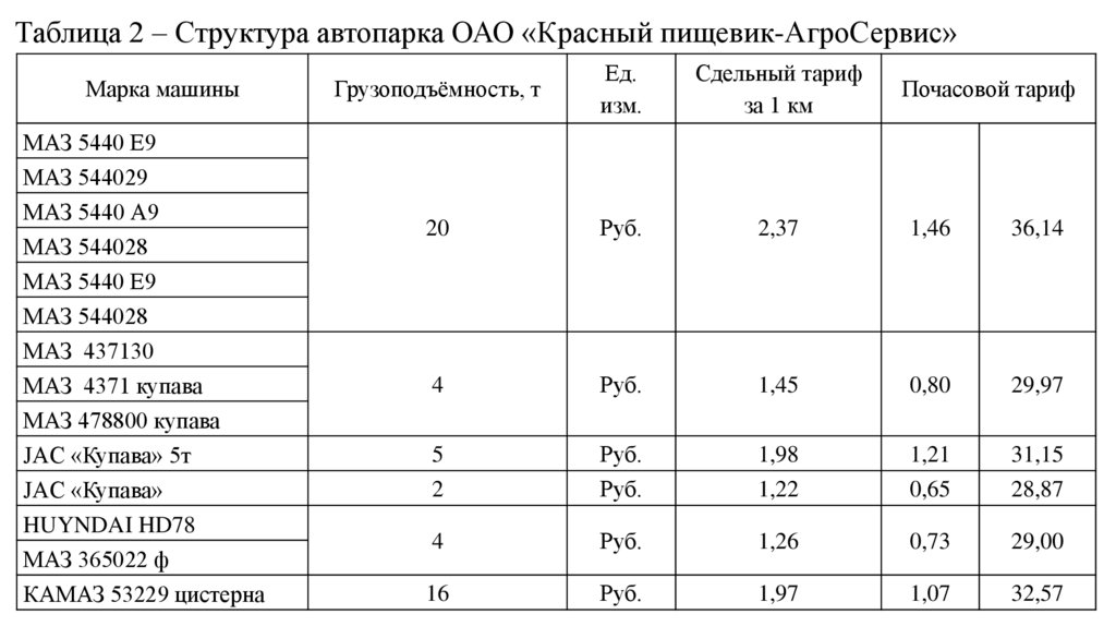 Таблица 2 – Структура автопарка ОАО «Красный пищевик-АгроСервис»Марка машины