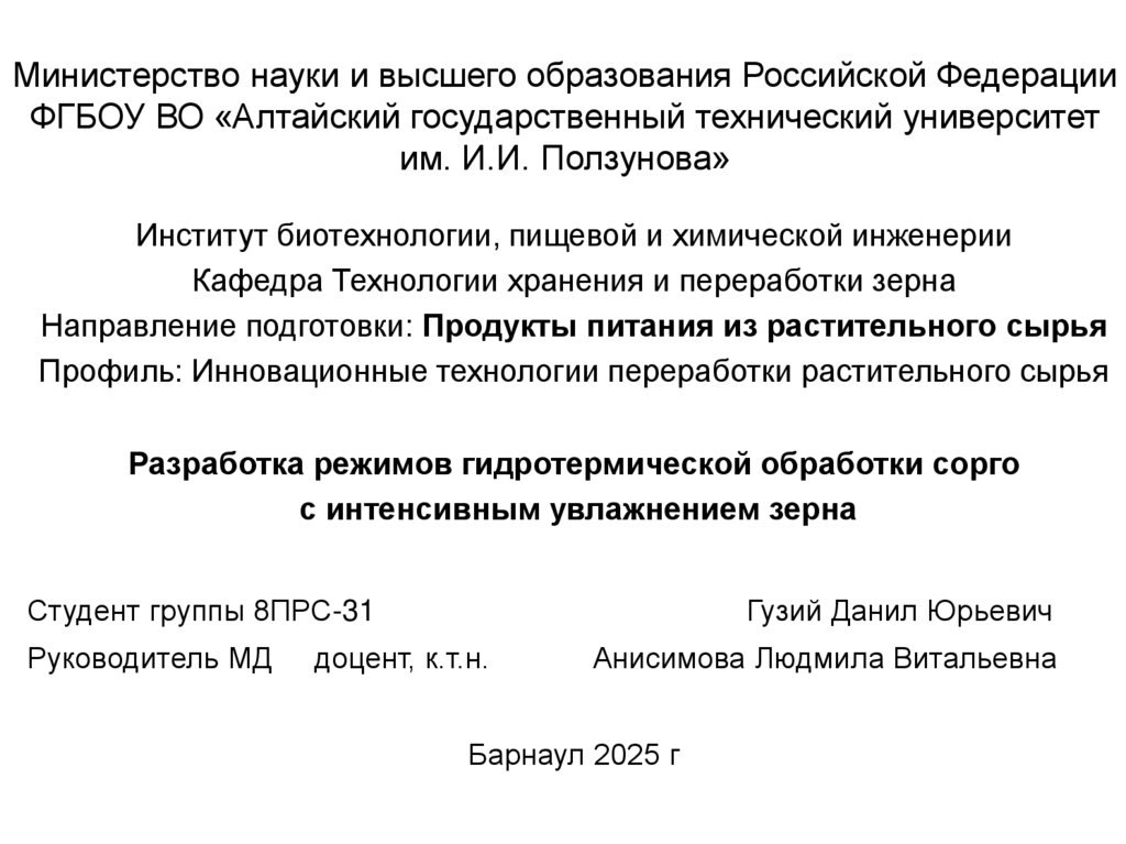 Разработка режимов гидротермической обработки сорго с интенсивным увлажнением зерна