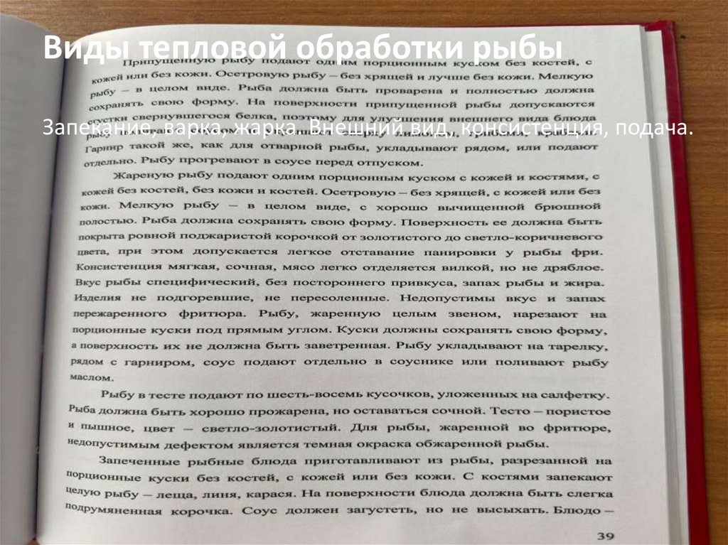 Виды тепловой обработки рыбыЗапекание, варка, жарка. Внешний вид, консистенция, подача.