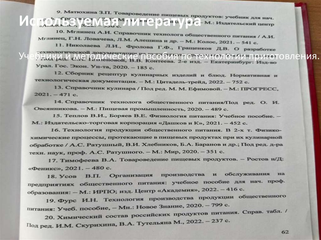 Используемая литератураУчебники и методические пособия по технологии приготовления.