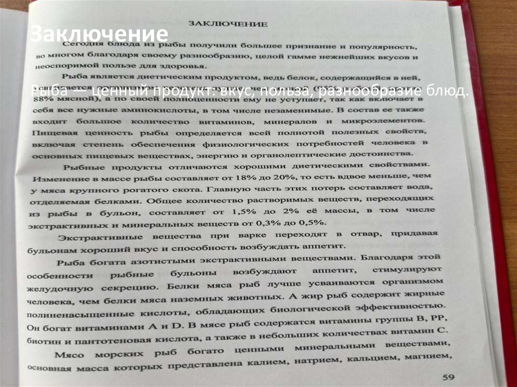 ЗаключениеРыба — ценный продукт: вкус, польза, разнообразие блюд.