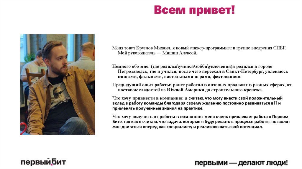 Меня зовут Круглов Михаил, я новый стажер-программист в группе внедрения СПБГ.Мой руководитель — Мишин Алексей.