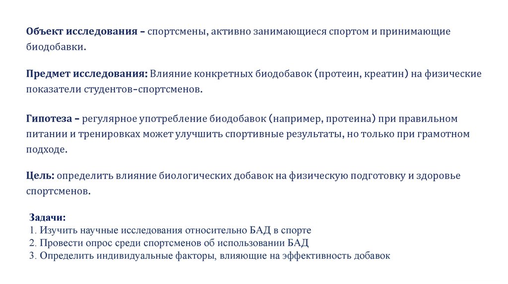 Предмет исследования: Влияние конкретных биодобавок (протеин, креатин) на физические