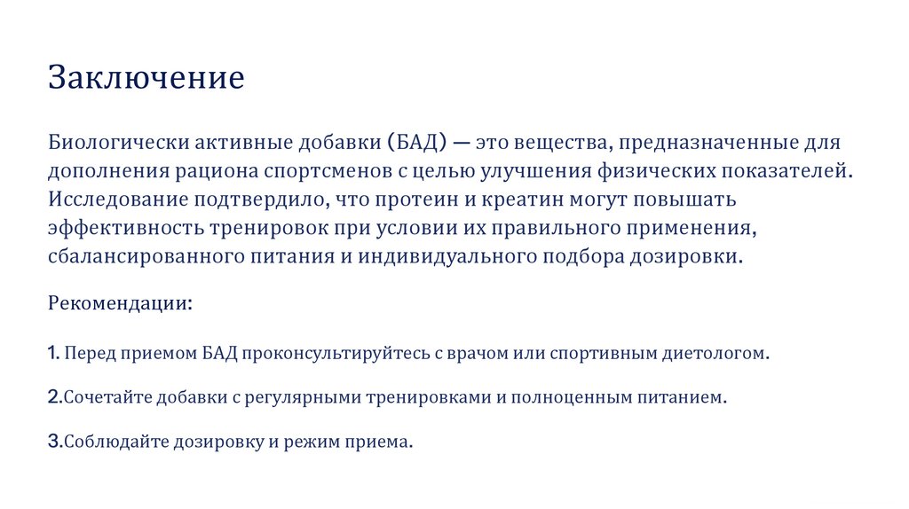 ЗаключениеБиологически активные добавки (БАД) — это вещества, предназначенные для