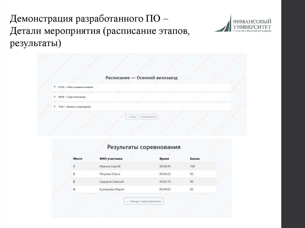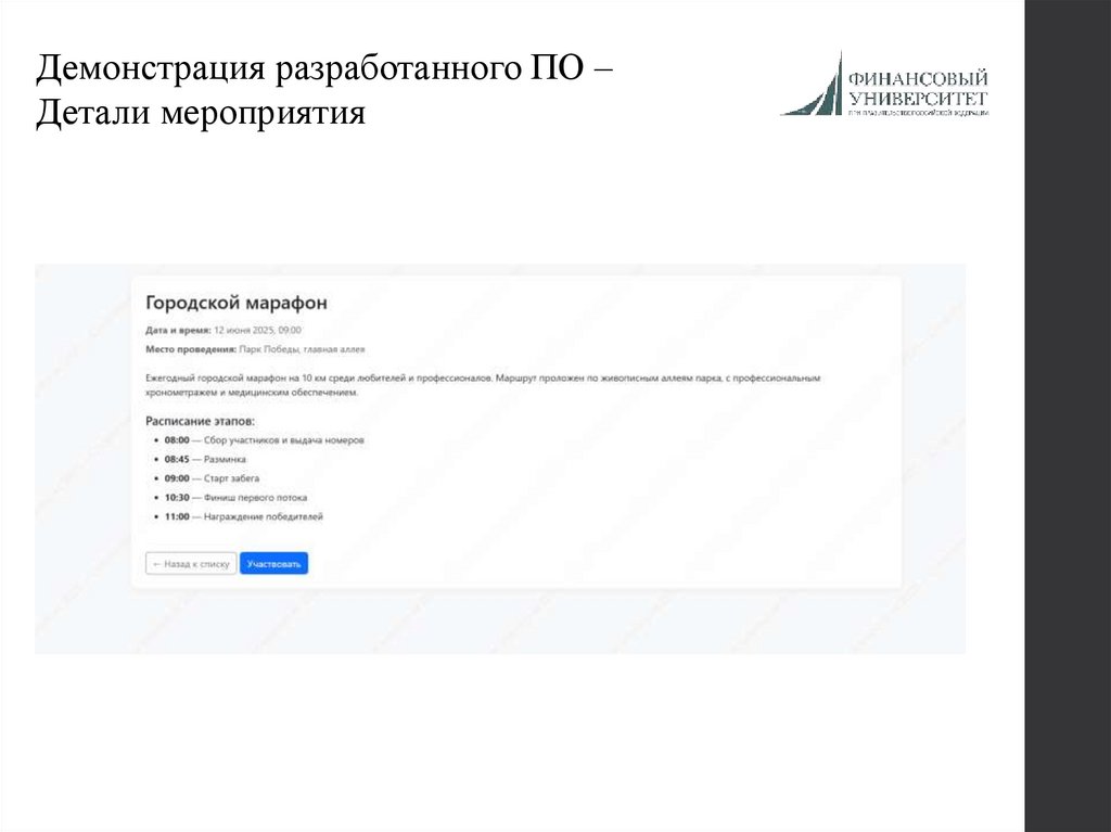 Демонстрация разработанного ПО –Детали мероприятия (расписание этапов,