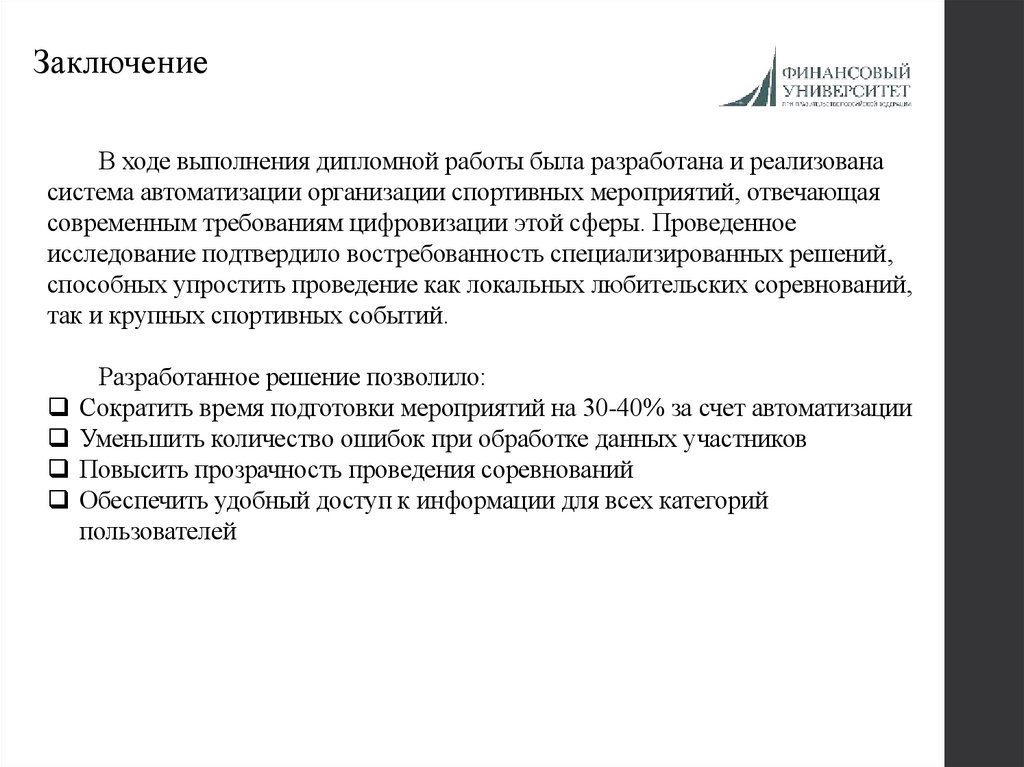 ЗаключениеВ ходе выполнения дипломной работы была разработана и реализована