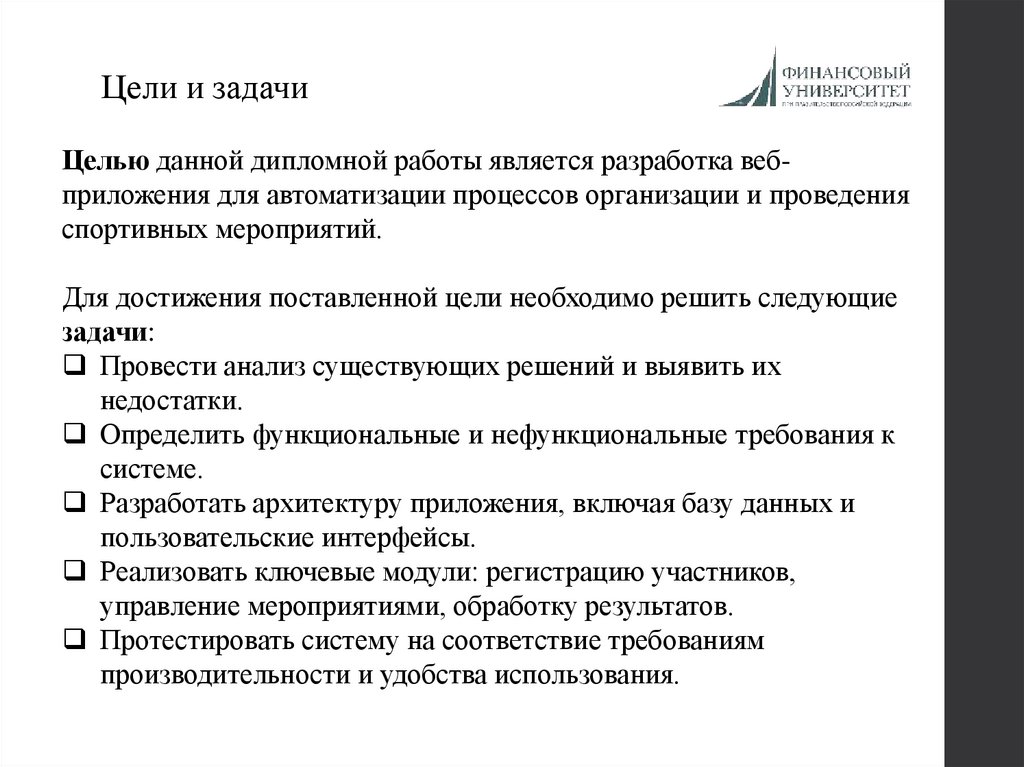 Цели и задачиЦелью данной дипломной работы является разработка вебприложения для автоматизации процессов организации и проведения