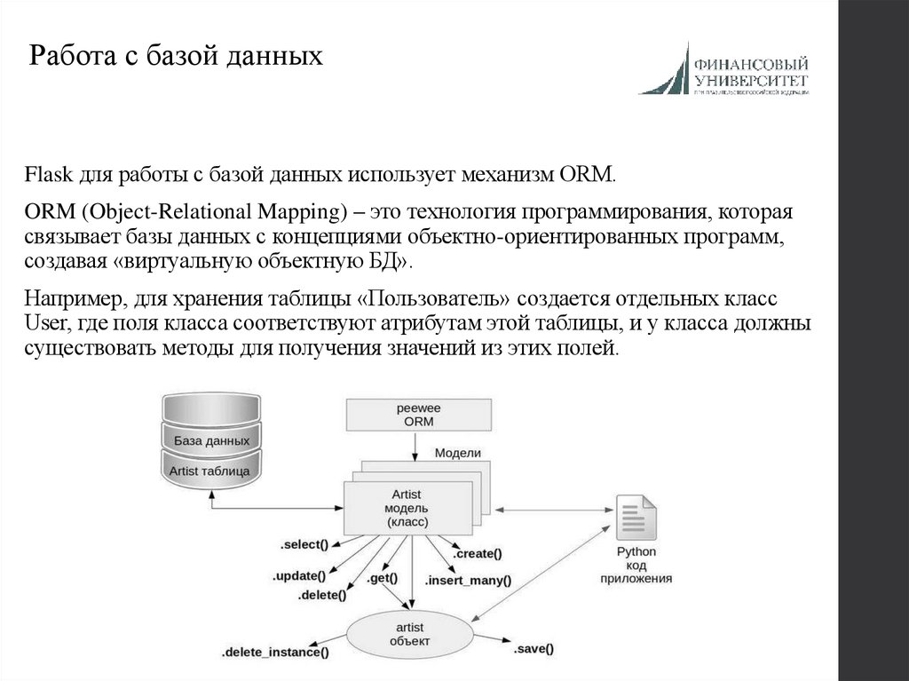 Работа с базой данныхFlask для работы с базой данных использует механизм ORM.