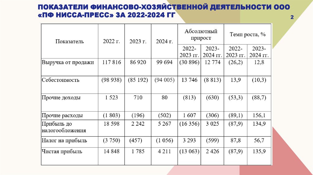 ПОКАЗАТЕЛИ ФИНАНСОВО-ХОЗЯЙСТВЕННОЙ ДЕЯТЕЛЬНОСТИ ООО«ПФ НИССА-ПРЕСС» ЗА 2022-2024 ГГ