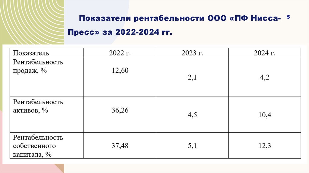 Показатели рентабельности ООО «ПФ НиссаПресс» за 2022-2024 гг.5