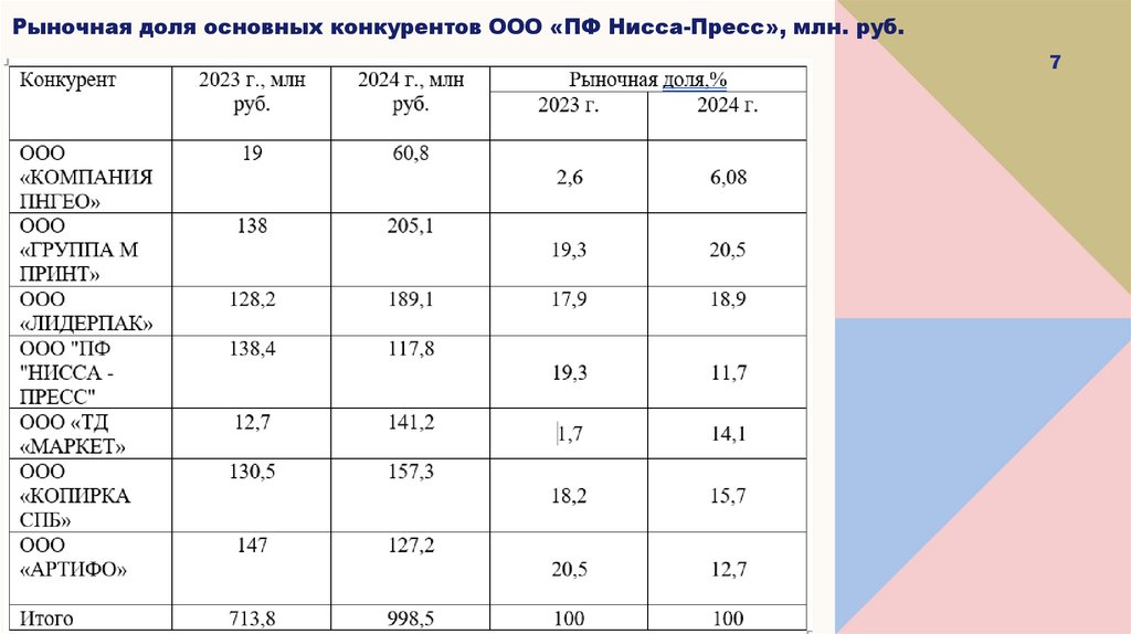 Рыночная доля основных конкурентов ООО «ПФ Нисса-Пресс», млн. руб.7