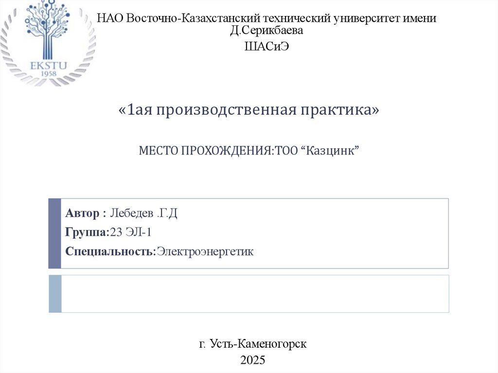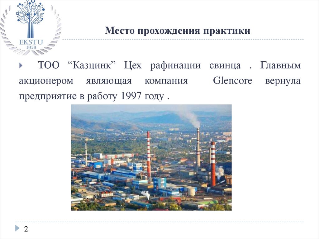 Первая производственная практика. Место прохождения: ТОО “Казцинк”