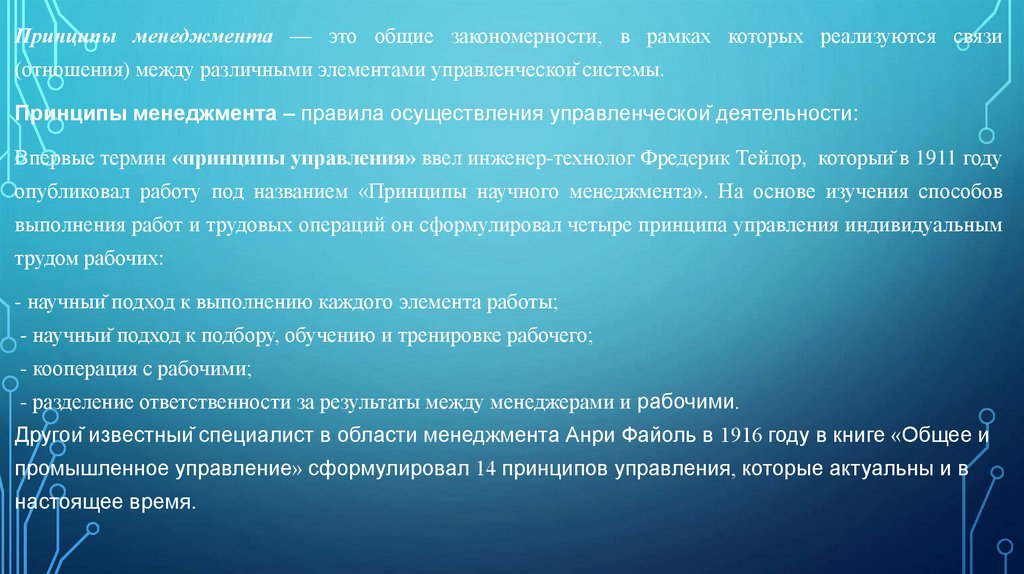 Впервые термин «принципы управления» ввел инженер-технолог Фредерик Тейлор, который в 1911 году