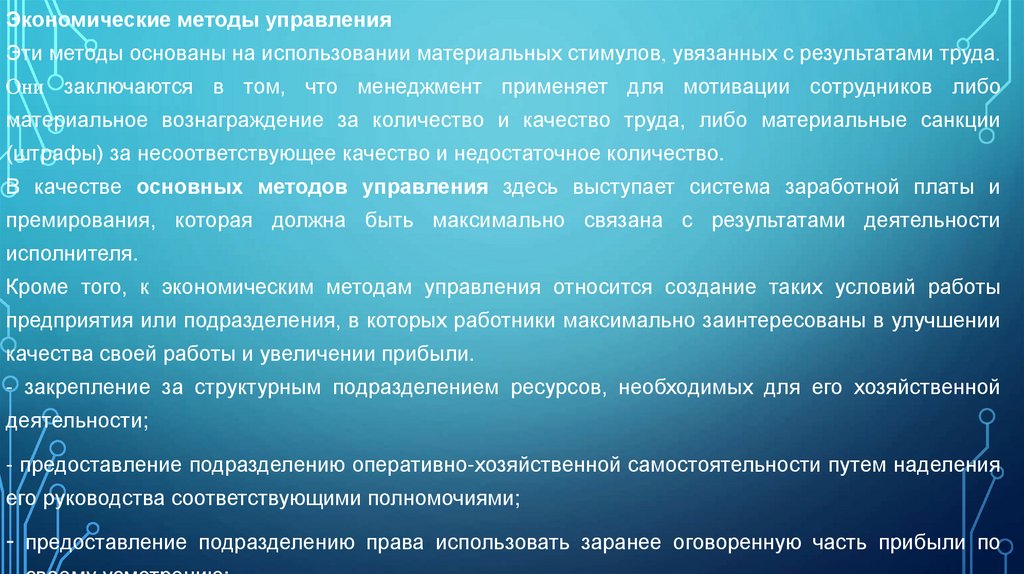 Кроме того, к экономическим методам управления относится создание таких условий работы