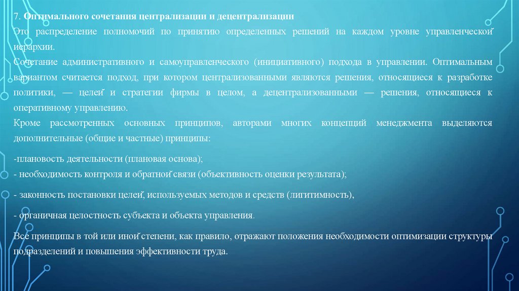 7. Оптимального сочетания централизации и децентрализацииЭто распределение полномочий по принятию определенных решений на каждом уровне управленческой