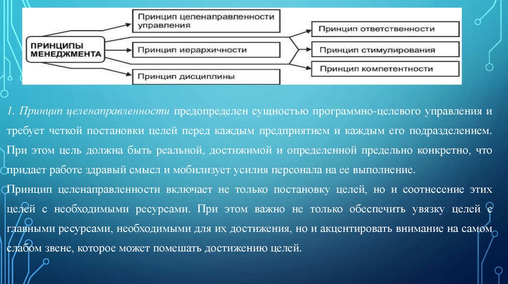 1. Принцип целенаправленности предопределен сущностью программно-целевого управления итребует четкой постановки целей перед каждым предприятием и каждым его подразделением.