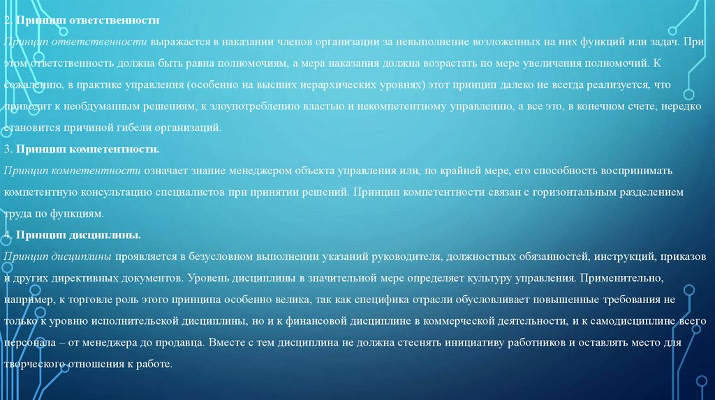 2. Принцип ответственностиПринцип ответственности выражается в наказании членов организации за невыполнение возложенных на них функций или задач. При