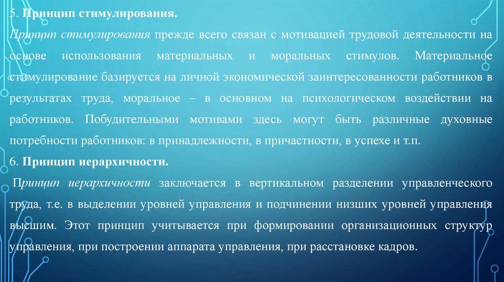 5. Принцип стимулирования.Принцип стимулирования прежде всего связан с мотивацией трудовой деятельности на