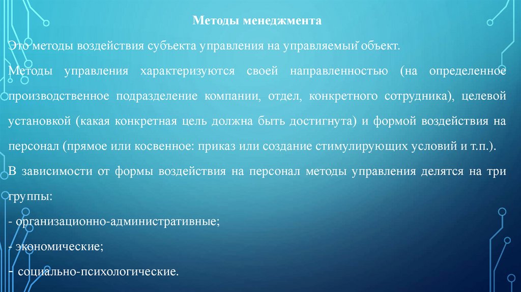 Методы менеджментаЭто методы воздействия субъекта управления на управляемый объект.