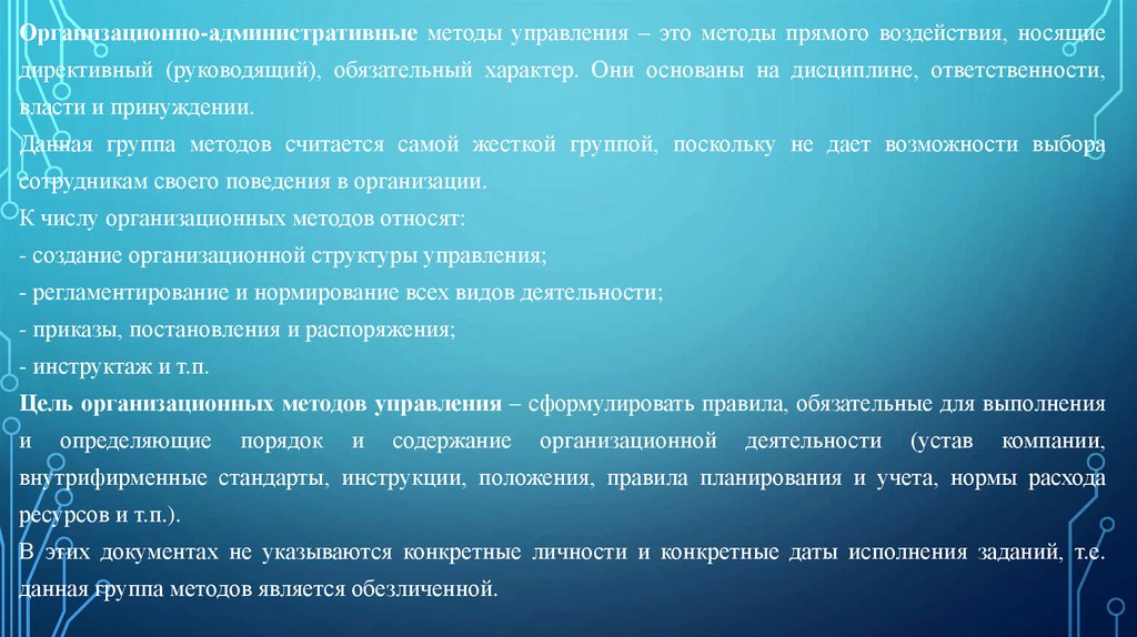 Цель организационных методов управления – сформулировать правила, обязательные для выполнения