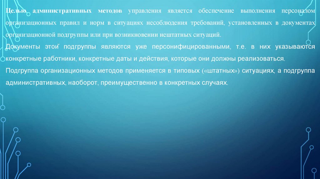 Целью административных методов управления является обеспечение выполнения персоналоморганизационных правил и норм в ситуациях несоблюдения требований, установленных в документах