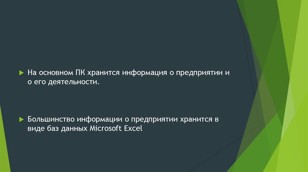 На основном ПК хранится информация о предприятии ио его деятельности.