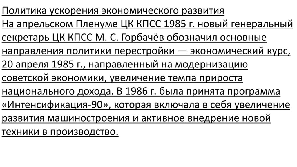 Политика ускорения экономического развитияНа апрельском Пленуме ЦК КПСС 1985 г. новый генеральный