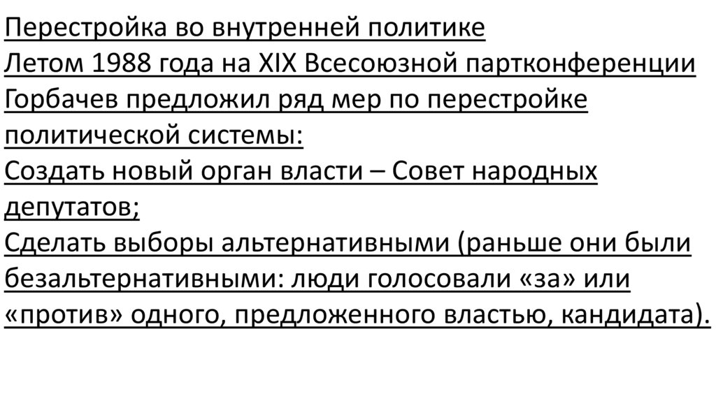 Перестройка во внутренней политикеЛетом 1988 года на XIX Всесоюзной партконференции