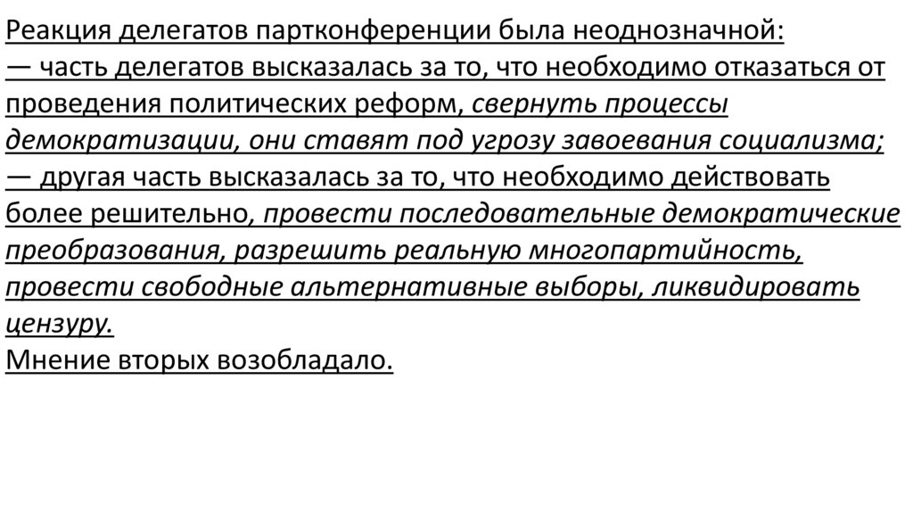 Реакция делегатов партконференции была неоднозначной:— часть делегатов высказалась за то, что необходимо отказаться от