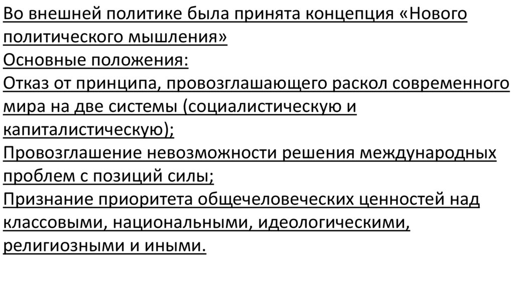 Во внешней политике была принята концепция «Новогополитического мышления»