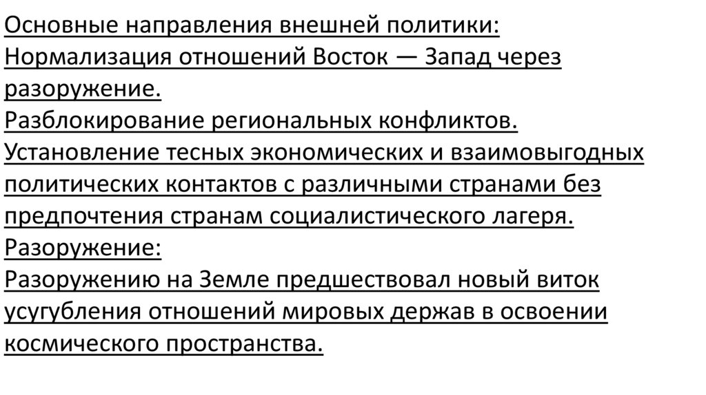 Основные направления внешней политики:Нормализация отношений Восток — Запад через