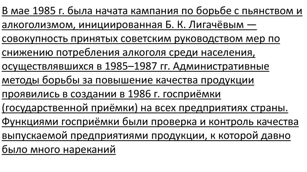 В мае 1985 г. была начата кампания по борьбе с пьянством иалкоголизмом, инициированная Б. К. Лигачёвым —
