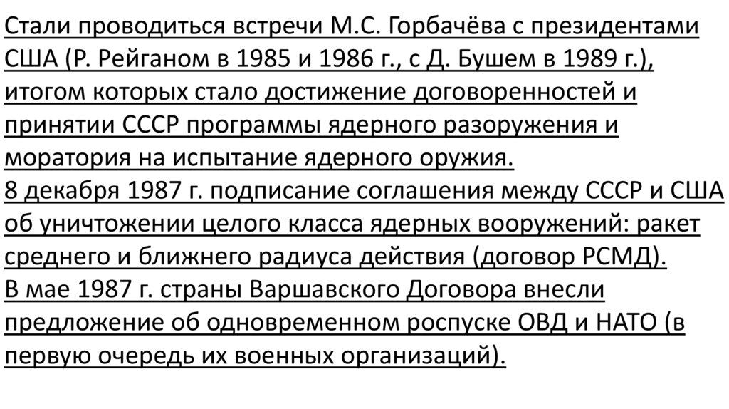 Стали проводиться встречи М.С. Горбачёва с президентамиСША (Р. Рейганом в 1985 и 1986 г., с Д. Бушем в 1989 г.),