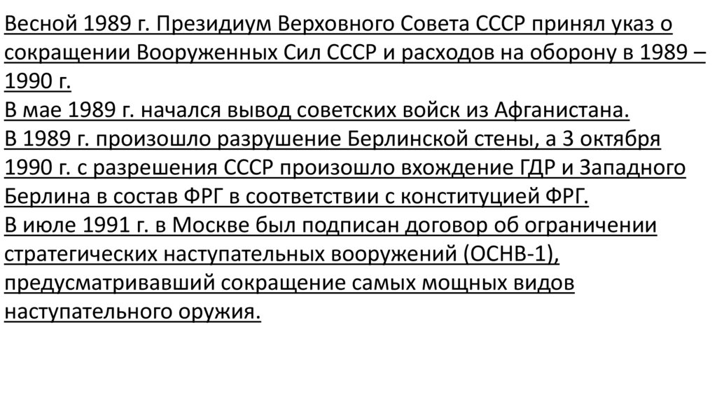 Весной 1989 г. Президиум Верховного Совета СССР принял указ осокращении Вооруженных Сил СССР и расходов на оборону в 1989 –