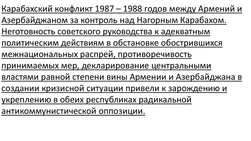 Карабахский конфликт 1987 – 1988 годов между Армений иАзербайджаном за контроль над Нагорным Карабахом.