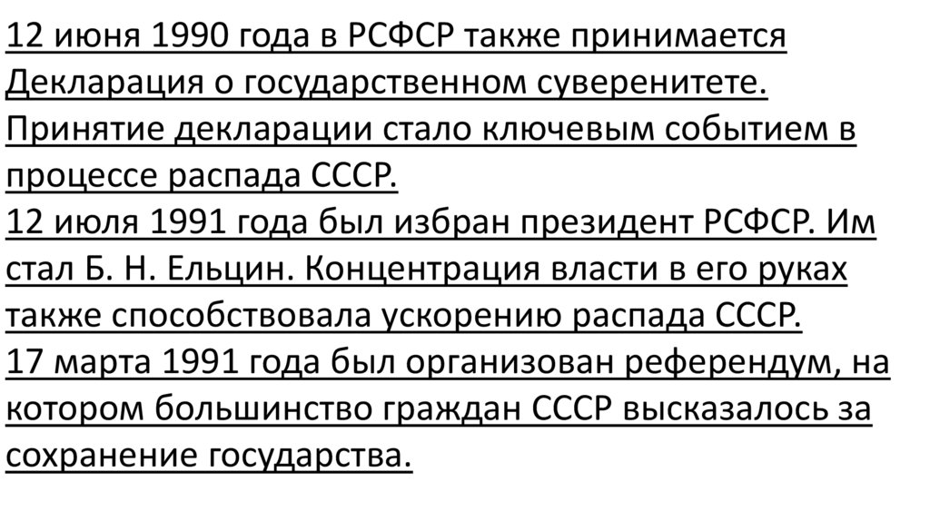 12 июня 1990 года в РСФСР также принимаетсяДекларация о государственном суверенитете.